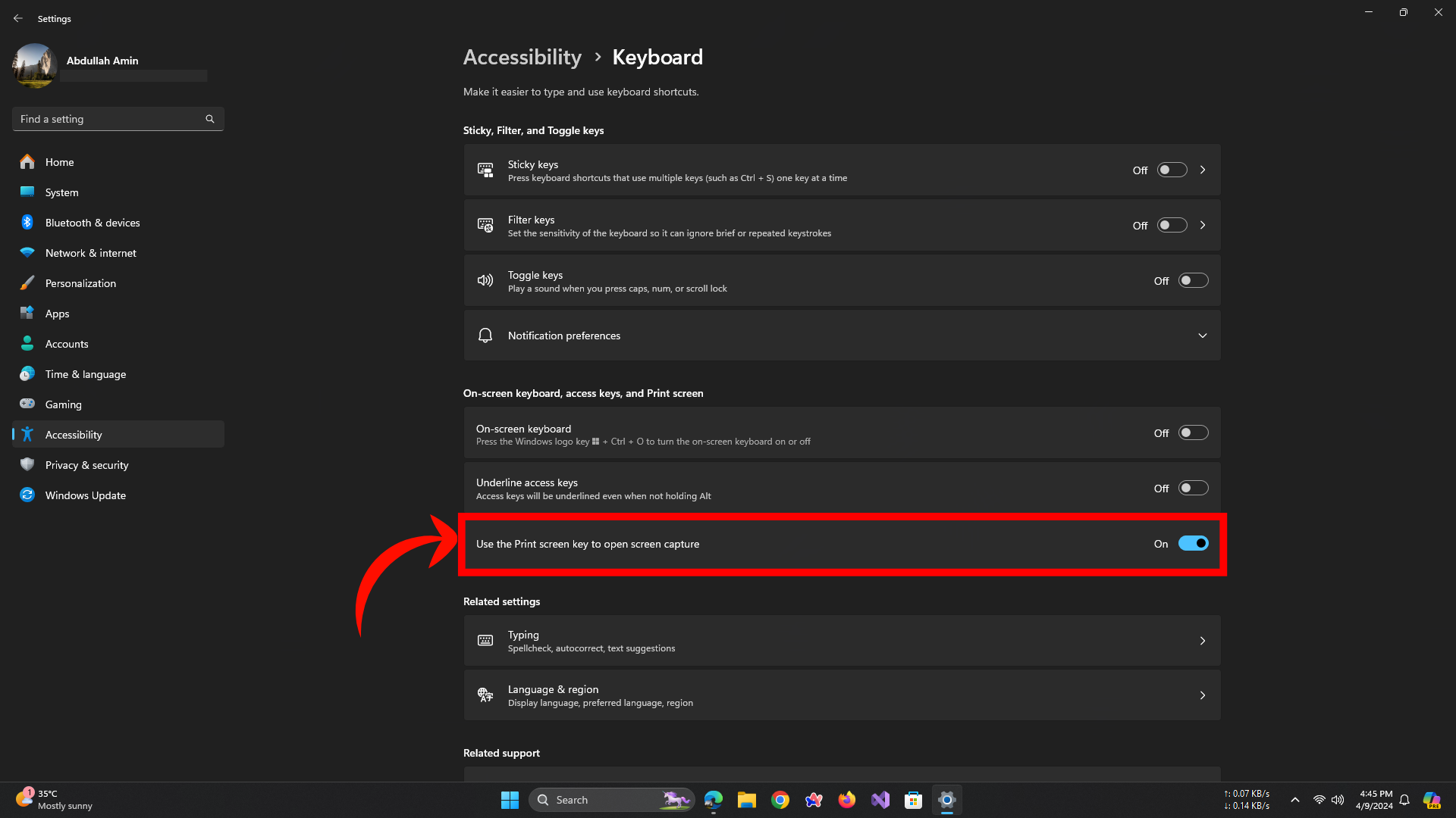 - Under the “Print Screen shortcut” section, turn on the “Use the Print Screen Key to open screen capture” toggle switch.