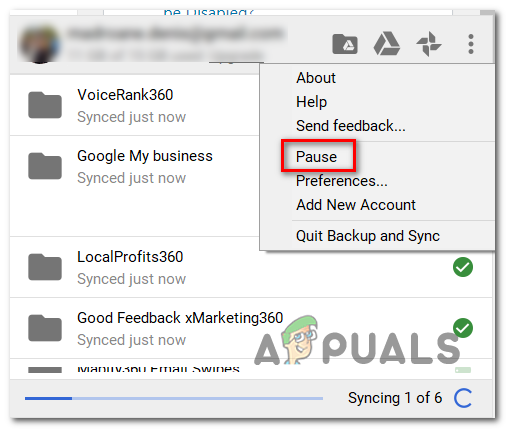 - If you see that the utility is actively syncing files, click on the action button (top-right corner) and click on Pause from the newly appeared cotext menu.