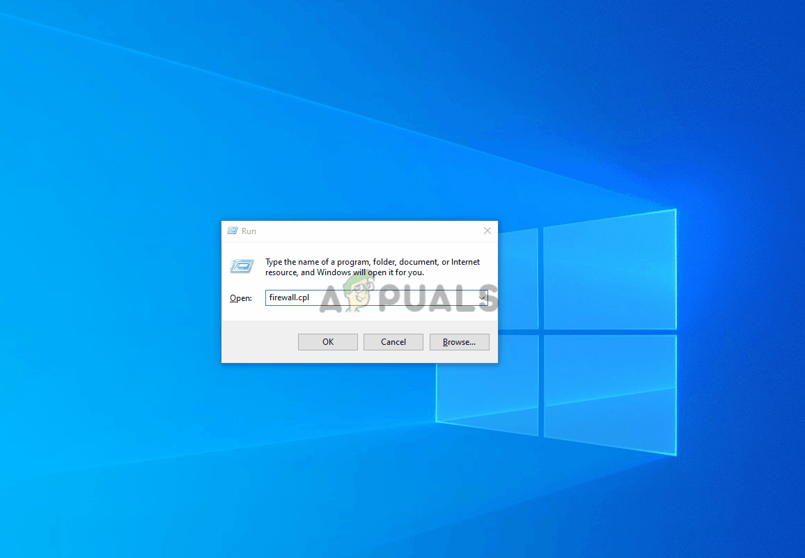 - Press Windows key + R to open up a Run dialog box. Next, type ‘firewall.cpl’ inside the text box and press Enter to open up the Windows Firewall settings window.