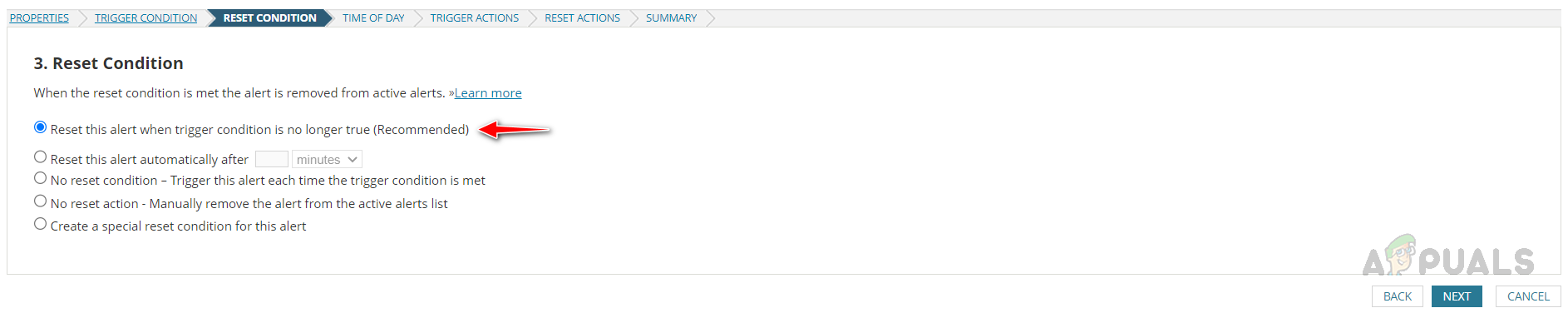 If you don’t want to trigger the alert immediately once the device status goes down, check the “Condition must exist for more than” option and specify the time you want to delay the alert. Once done, click on Next. - In the Reset Condition section, use the default reset condition.
