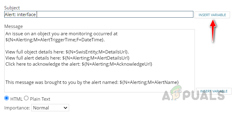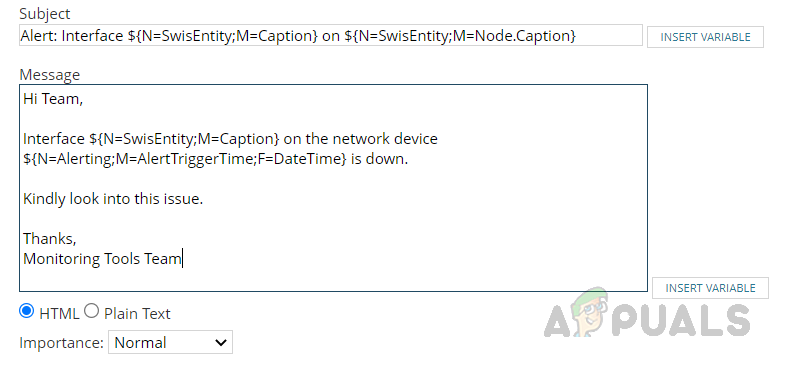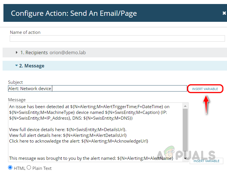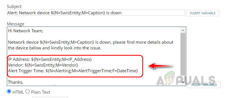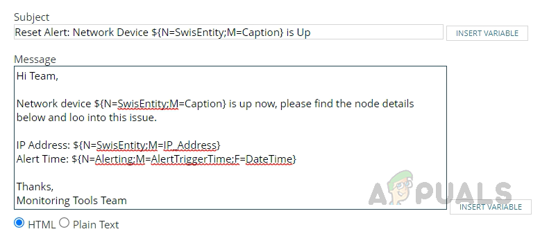 - Let’s modify the default message. We can use the Insert Variable option to call the device and alert related fields like device name, IP address, alert name, alert triggered time, etc.