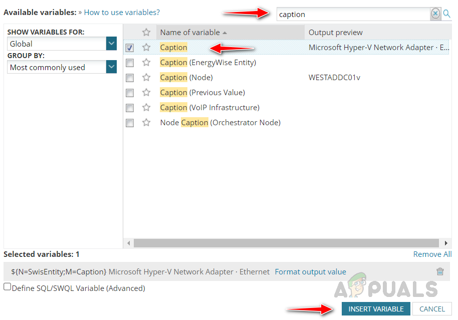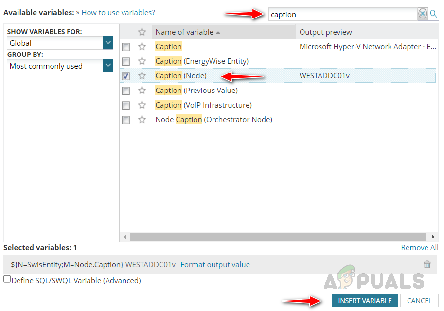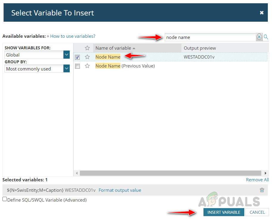- Search for Node Name in the search box, select the variable and click on Insert Variable.