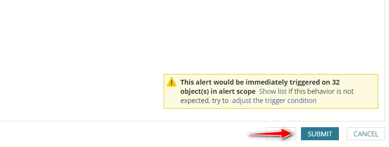 - Before submitting the alert, you can see how many alerts will be triggered for the condition. With this, we can validate whether the alert condition is correct. If not, reconfigure the alert condition.
