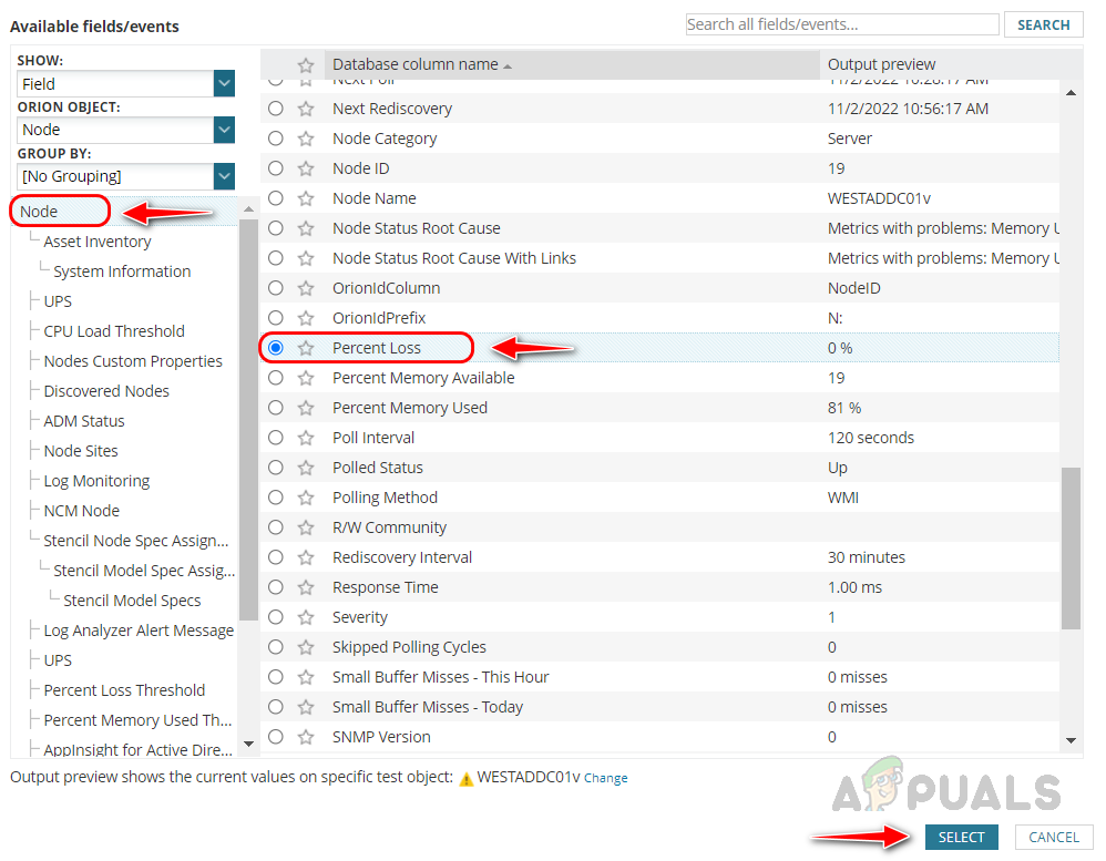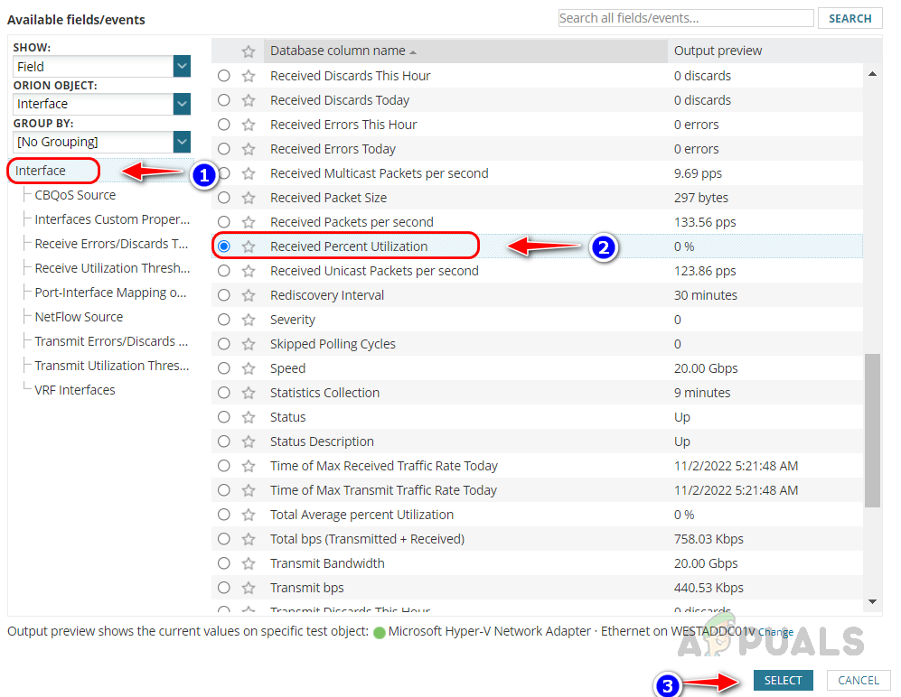 - Select Received Percent Utilization from the Interface table and click on Select.
