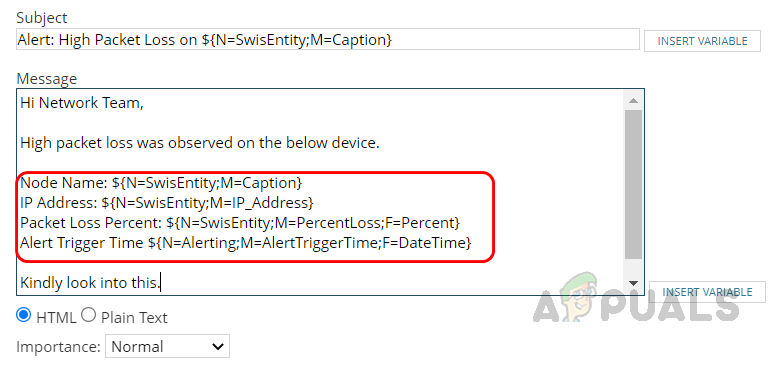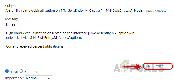 - Once you have added the interface name and node details on the message body, click Insert Variable to bring the received percent utilization.
