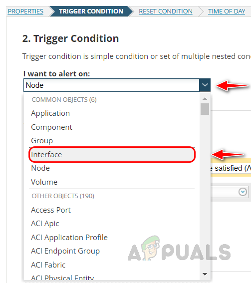 - Since we are configuring the alert for the interface, we need to change the object to interface on I want to alert on tab. To do that, click the drop-down menu and select interface from the list.
