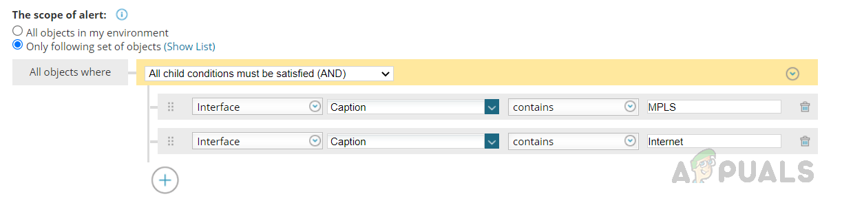 - You can set alerts for all the interfaces or specific interfaces like MPLS, Internet, etc. Filter the interfaces for the alert based on your needs. I have filtered only MPLS and Internet interfaces using the caption column.