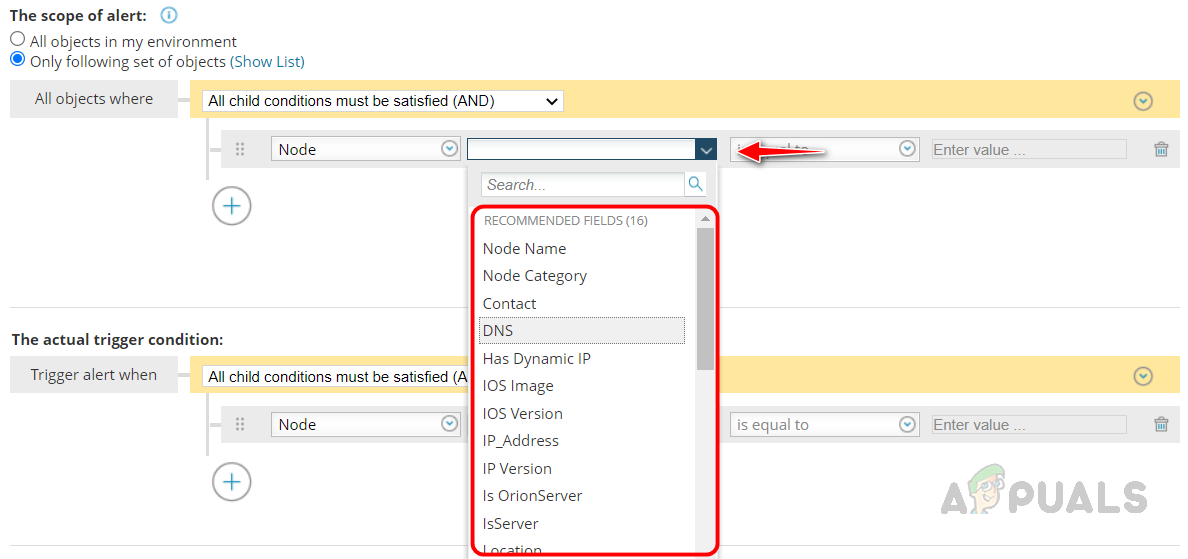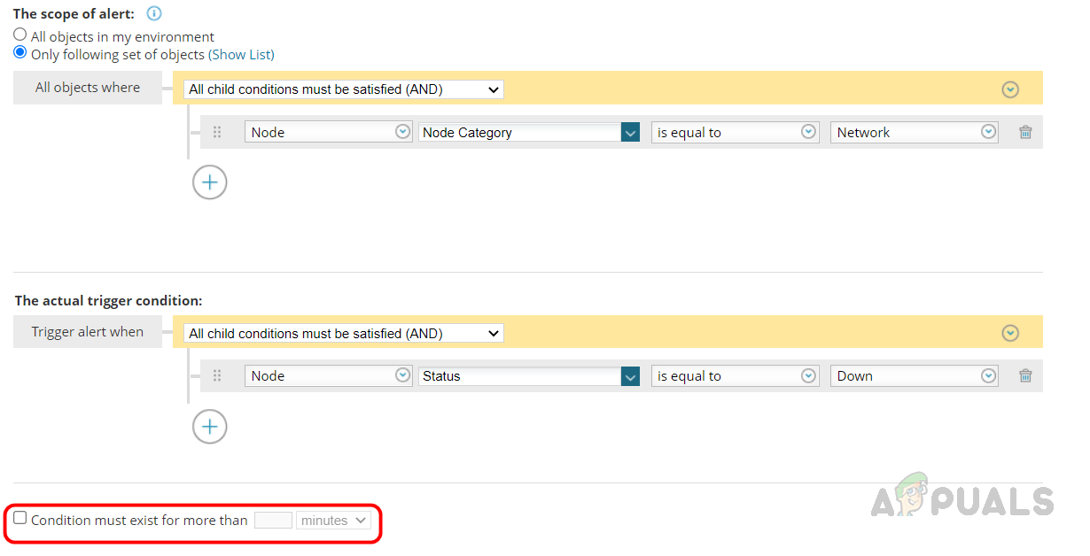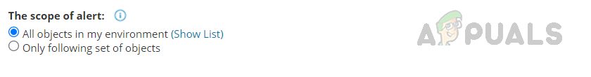 - In The scope of alert, select All objects in my environment if you want to set up an alert for all the devices monitored in Solarwinds. Select Only following set of objects if you’re going to set up an alert for a specific set of devices.