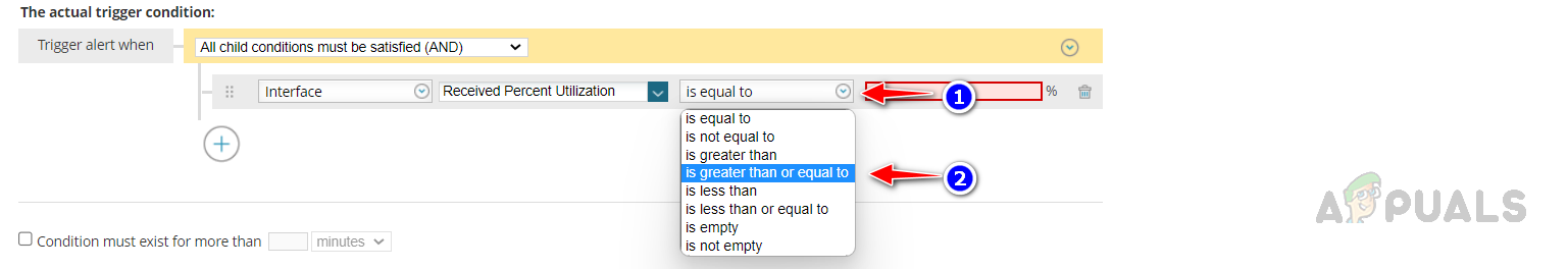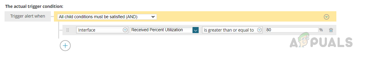 - Now we need to set up trigger conditions for the bandwidth utilization alert. Here let’s set up an alert for the received percent utilization if the utilization goes beyond 80%.