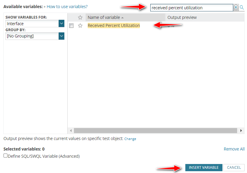 - Search for Received Percent Utilization, select the variable, and click on insert variable.