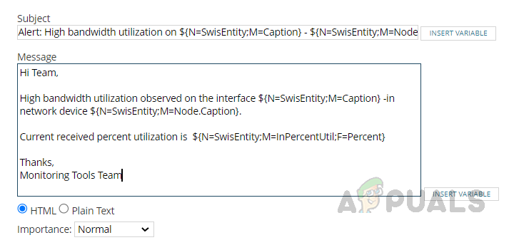 - Expand the Message section. We can see the default message configured by Solarwinds. We can use it or modify it.