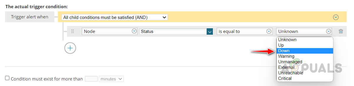 Once done, click on Next. - In the Trigger Condition section, choose Node under I want to alert on the drop-down list since we are configuring an alert for Node down.