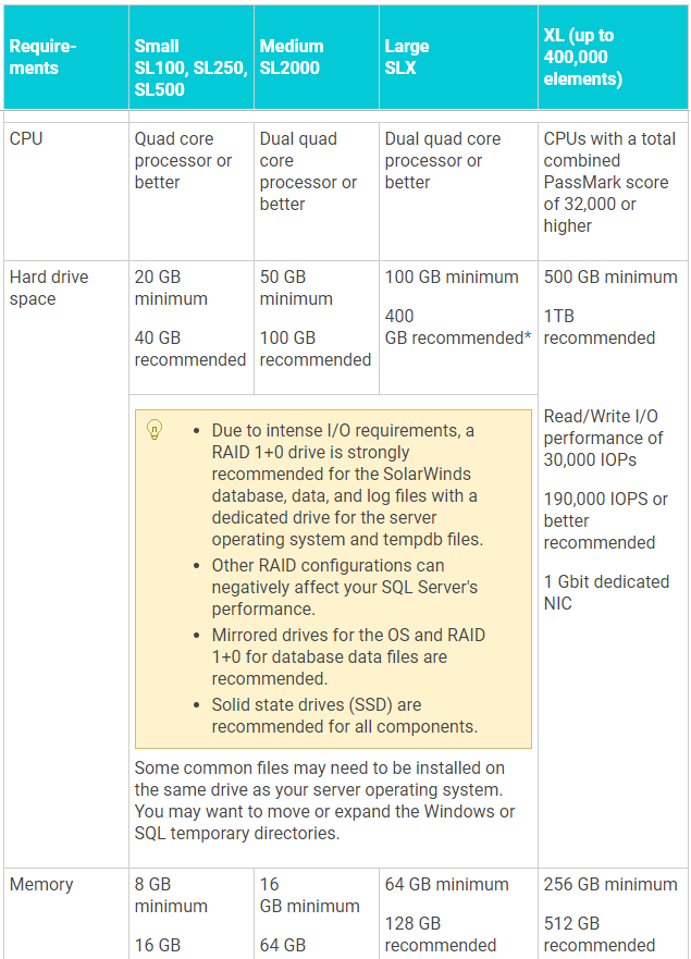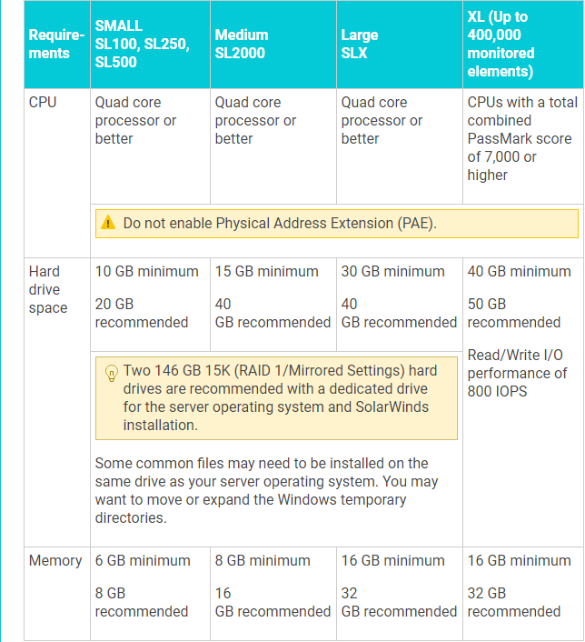 These will vary depending on the number of elements you are monitoring. Also, note that what I am giving you is the minimum recommendations and may vary depending on several factors. For instance, if you install additional Orion platform-tools on the same computer then you will need more hardware resources.