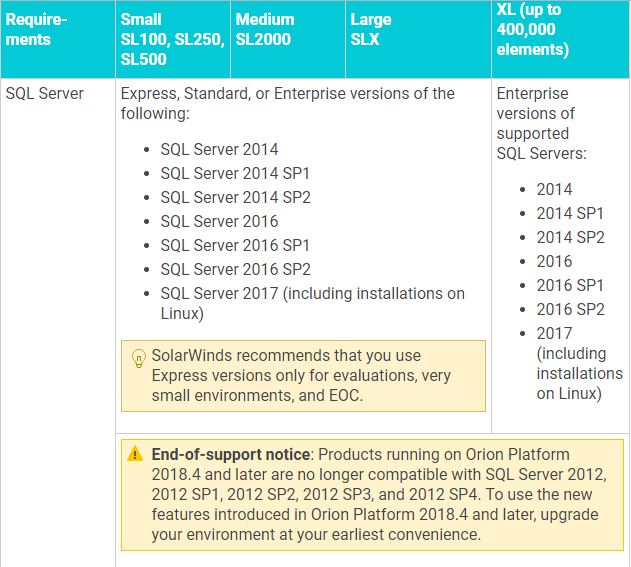 Again, the requirements will depend on the environment size you are monitoring. And remember that the application and database servers must be installed on separate servers. If you install the Orion server on your virtualization environment then the SQL server needs to be on a separate and physical server. Regarding the best database server, if you are using the Orion Platform 2018.2 you can use Amazon RDS while those using Orion Platform 2019.2 can use Microsoft Azure SQL.