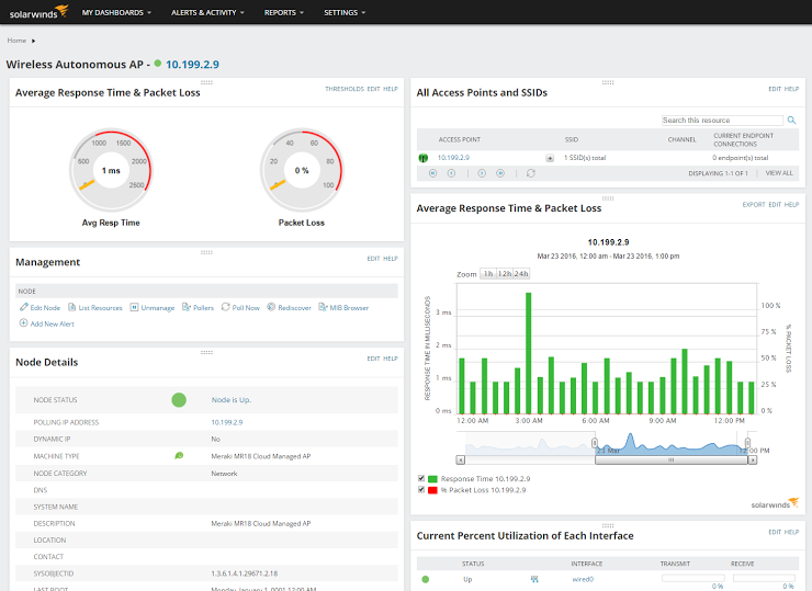 The SolarWinds Network Performance Monitor has an integrated Wireless Poller that automatically discovers wireless devices including those being managed from the cloud. Moreover, it gives you the device information such as the client name, IP and Mac address and an Rx/Rt summary. It also polls important key performance data such as bandwidth utilization, current node status, average response time, packet loss and network strength. All of which will be crucial in making decisions such as when to add new switches and Wi-Fi boosters. Or where to position your router for the best signal strength.