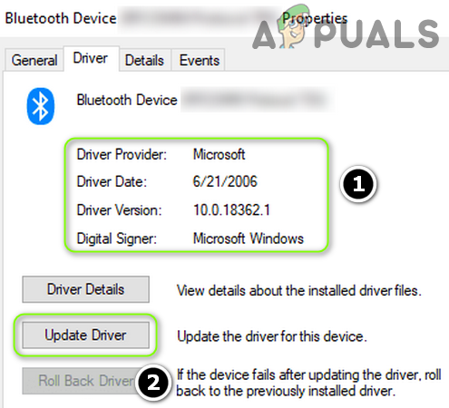 Open Properties of the Bluetooth Device in the Device Manager - Now, head to the Driver tab and note the Bluetooth driver in use. After that, click on the Update Driver button.