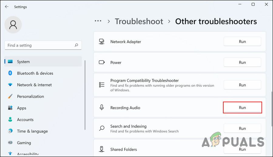 Access the Other troubleshooters option - Now, locate the Recording Audio troubleshooter and click on the Run button for it.