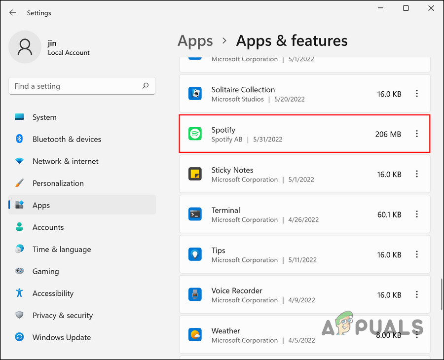 - Click on Apps & features in the left pane and on the right side of the window, locate Spotify.