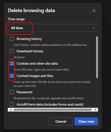 Clearing your browser’s cache and cookies removes these bad files, resets your session, and forces the browser to pull fresh data directly from Microsoft’s servers. This often restores normal functionality.