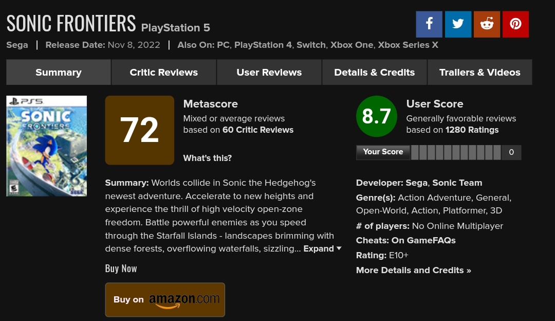 Sonic Frontiers was released on 8th November 2022, and the game received mixed reviews. Still, the fans loved it, and they are all in for a new Sonic Experience in an open world that Sonic Frontiers offers. The game is currently sitting at a solid 72/100 critic score on Metacritic; on the other hand, the game got an excellent user rating of 8.7.