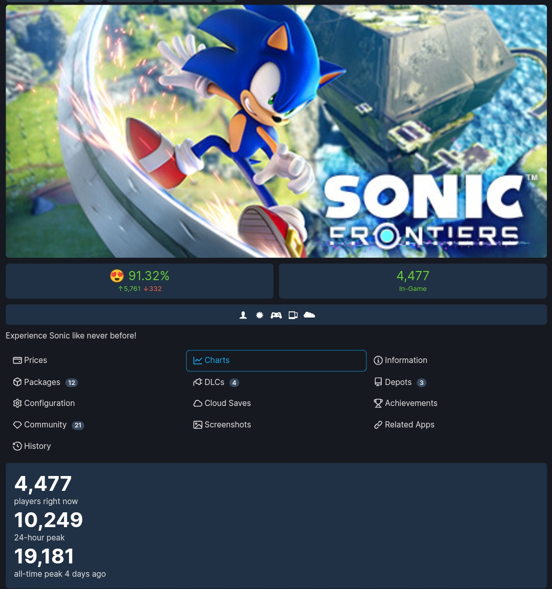 Sonic Frontiers is also looking promising on Steam charts as the game has managed to break the record of peak concurrent players in any Sonic game with over 19,181 concurrent players on Steam, beating the previous record of 11,937 concurrent players set by Sonic Mania.