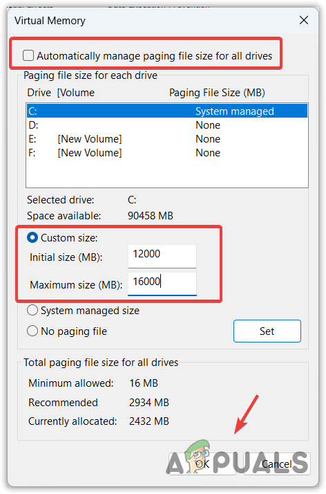 Opening Virtual Memory Settings - Untick Automatically manage paging file size for all drives.