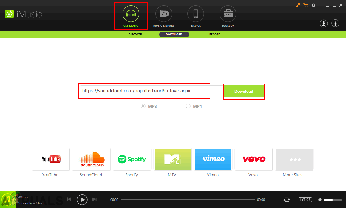 Copying the URL of the song - Go back to the iMusic application and click on the GET MUSIC button at the top. Here paste the link of the SoundCloud song and click on the Download button.