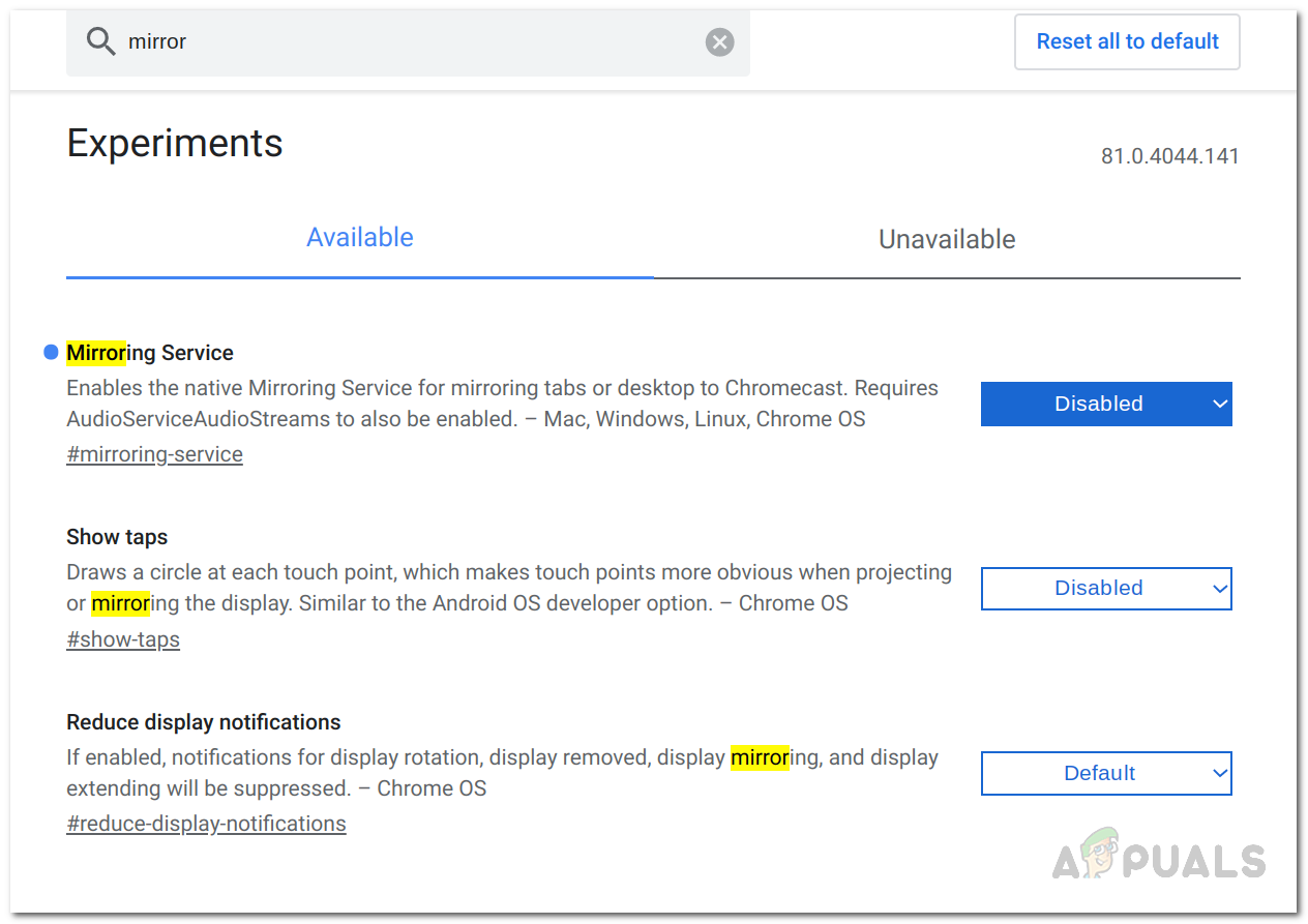 - This will show you a list of all the flags available. In the search field, type Mirroring Service.