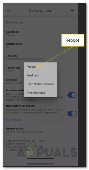 Chromecast Device Details - There, tap on the three dots found in the top-right corner which will bring up a new menu. From there, tap on the Reboot option to restart your Chromecast.