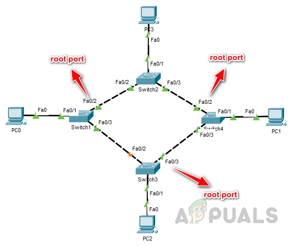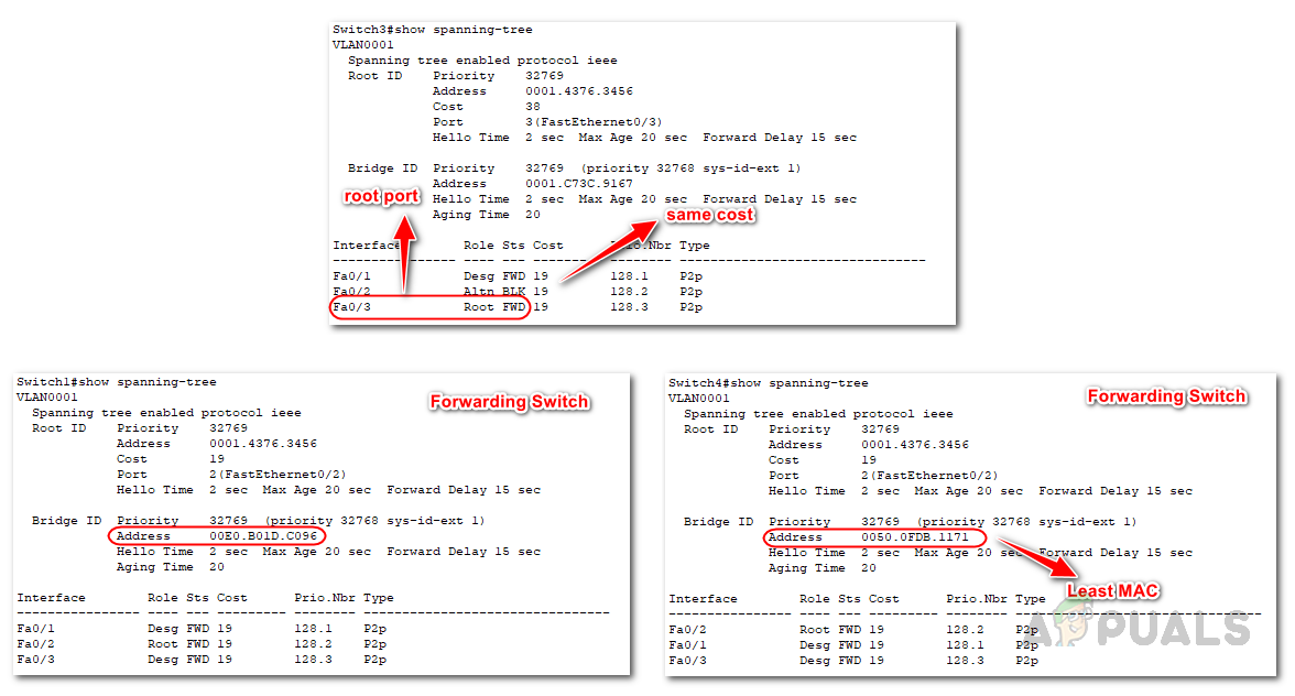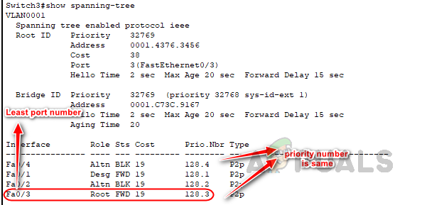 To break this tie, port priority is used as the tiebreaker. Since the port priority is also the same for these ports, the lowest port number is used as the deciding factor, resulting in the selection of port Fa0/3 as the root port.