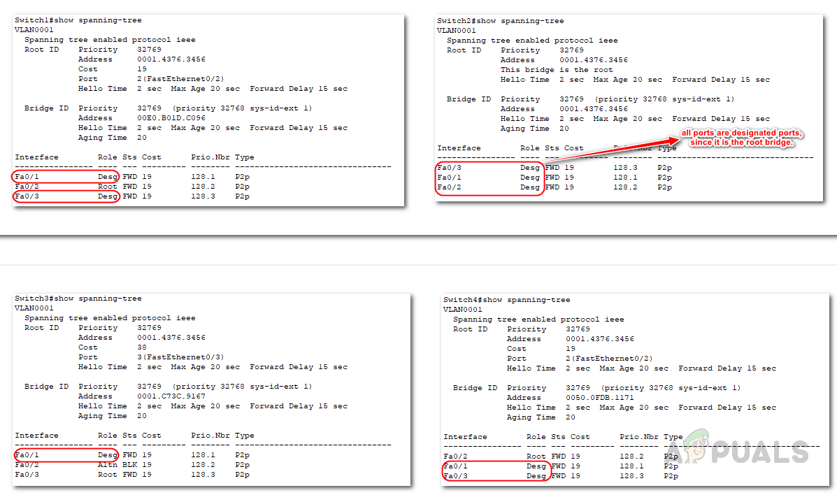 By default, switches have Spanning Tree Protocol (STP) enabled. Use the command below to verify the root bridge, root port, and designated port details.