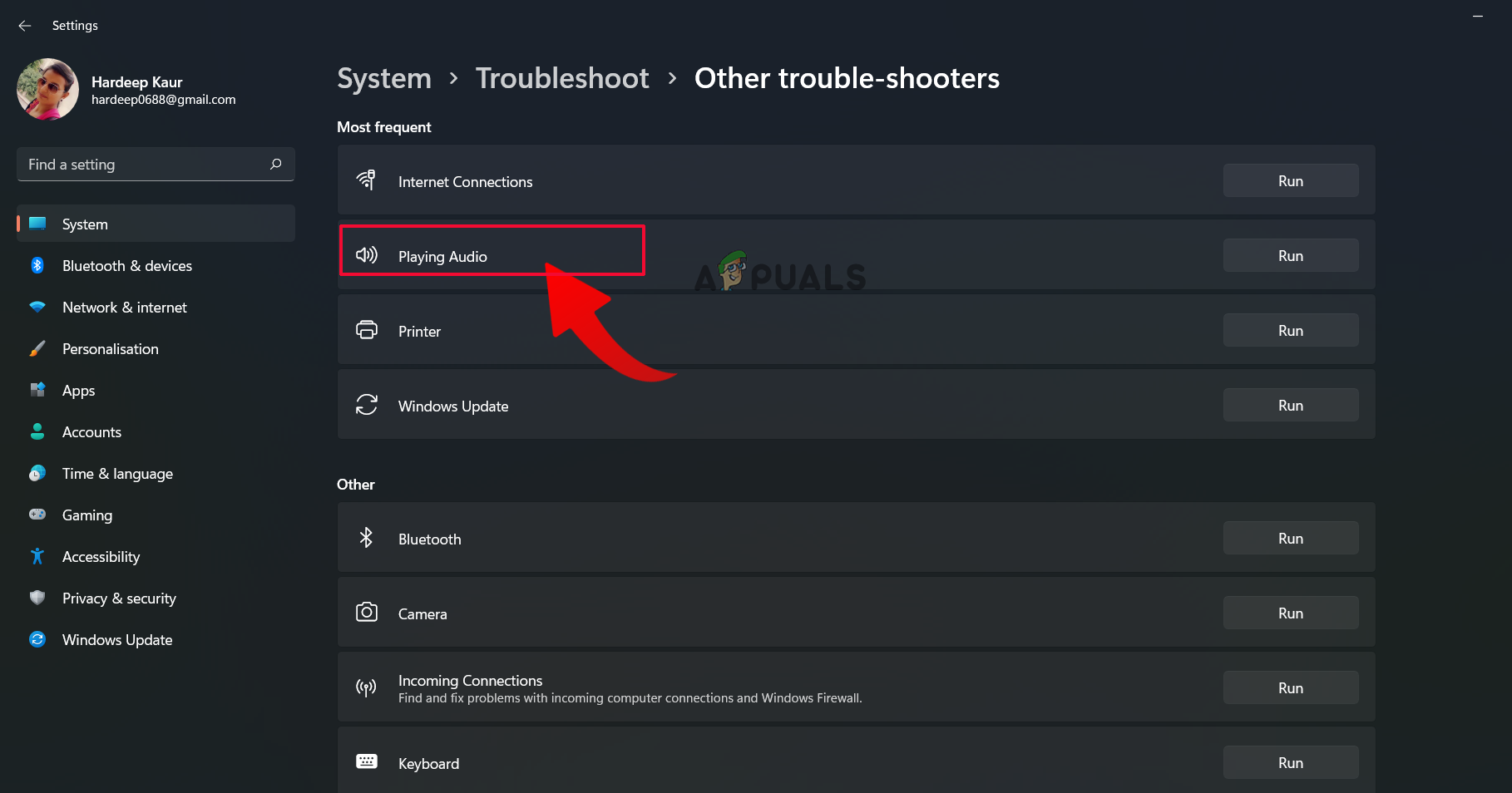 Open the Other Troubleshooters - Scroll down and you should discover the Most Frequent section. Go there and click the Run button associated with Playing Audio.
