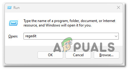 - Next, type ‘regedit’ inside the text box, then press Ctrl + Shift + Enter to open up Registry Editor with admin access.