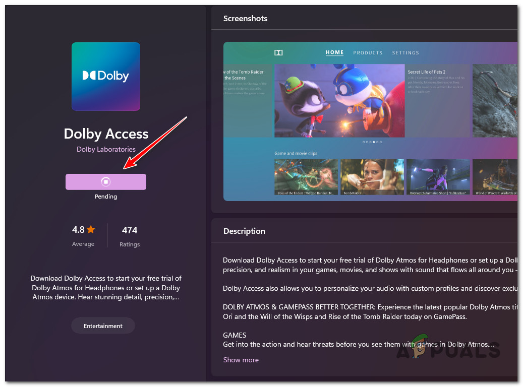 Downloading Dolby Access - Search for the dedicated app using the search bar at the top, then click on the Get button and wait until the app is downloaded and installed.