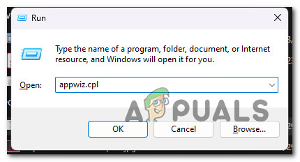 - Press the Windows key + R to open up a Run dialogue box. Next, type ‘appwiz.cpl’ and press Ctrl + Shift + Enter to open up the Programs and Features menu with admin access.