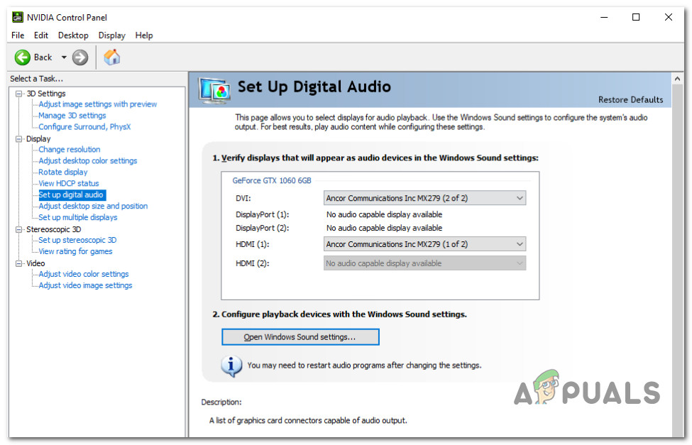 Open NVIDIA Control Panel - Once inside the NVIDIA Control panel, use the menu on the left to go under Display and click on Set up digital audio.