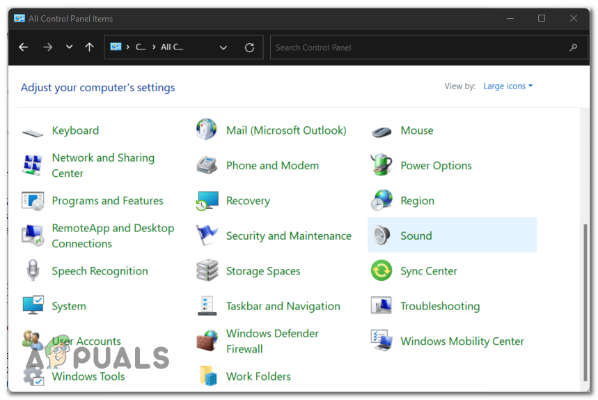 Opening the Control Panel using a Run dialog box - Once you are inside the Control Panel, you need to go to the Sound settings. Go to the View by section in the top right corner and select the Large icons menu to find the Sound section faster.