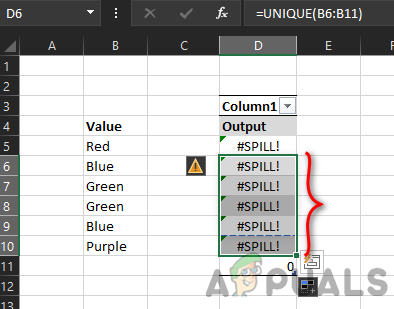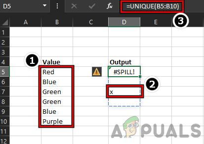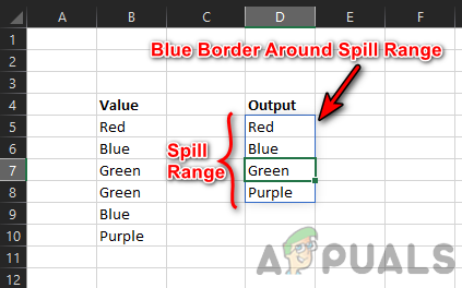 In this picture, there are two columns with data. Column B is the source data with different color names, whereas, cell D5 only holds the unique formula i.e., UNIQUE(B5:B10) but the formula’s result is shown from cell D5 to D8. Here, D5 to D8 is the Spill Range. If a user selects a single cell in the range, then a blue border will be shown around the whole spill range.