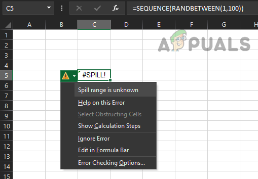 Excel may show #spill error with the cause of Spill Range is Unknown if the formula contains a volatile function. Volatile functions are those functions whose output is recalculated with every change of the sheet. If an array formula is using a volatile function, then with every output into the spill range, the sheet will be recalculated and this will trigger a non-ending cycle of recalculations, thus resulting in Spill Range is unknown. One such example is the formula below: