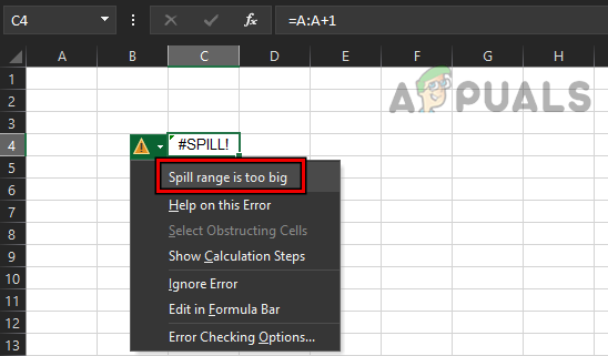 A user may see a spill error in Excel due to Spill Range Too Big if the Spill Range is going beyond the worksheet’s columns or rows, for example, if the following formula is entered in Excel (except the first row), it will trigger #spill error due to Spill Range Too Big.