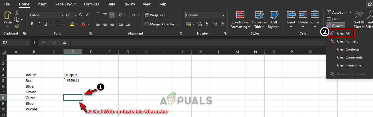 Keep in mind that there can be some cases, where a cell may contain an invisible character (like a space in a cell) and due to this Excel might mark it as a non-empty cell but the user may find it difficult to find the problematic character, so, look for those cells as well. To clear a cell with an invisible character (use Select Obstructing Cells to find out the problematic cells), a user may select the cell, click on Clear (in Editing section) on the Home tab of Excel, and then click on Clear All.