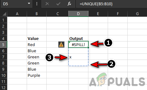 #Spill Error in Excel - Now a user will notice a #spill error in the formula cell (here, D5) because the cell D7 of the spill range is already filled with the value X.