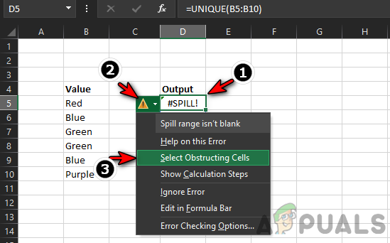- Now click on Select Obstructing Cells and then delete the contents of the problematic cells or move the contents to other cells. Keep in mind if multiple cells are blocking the Spill Range, then all the obstructing cells will be selected when Select Obstructing Cells is selected.