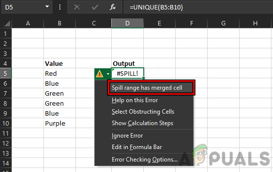 A user may encounter the #spill error in Excel if the Spill Range contains merged cells. Here, unmerging the merged cells in the Spill Range may clear the #spill error.