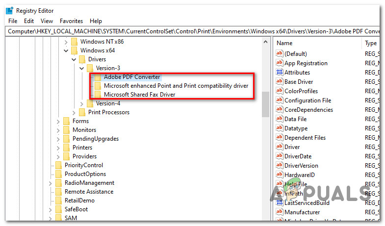 Several affected users dealing with the same kind of issue have reported that they were finally able to fix this problem by navigating to the HKEY_LOCAL_MACHINE\SYSTEM\CurrentControlSet\Control\Print\Environments\Windows x64\Drivers inside Registry Editor and deleting a couple of sub-keys prior to stopping the printer spooler and deleting the associated files.
