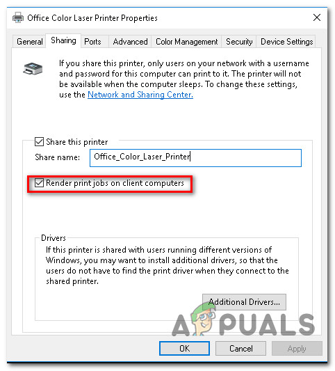 This method was used by a lot of affected users and the majority of them have reported that once they have disabled the Render print jobs on client computers feature from the Sharing tab of their printer Settings, the error pop up went away permanently.