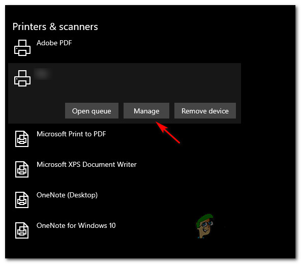 Accessing the Printers tab - Once you’re inside the Printers & Scanners tab, move over to the right-hand side section and click on the printer that you suspect might trigger this issue. Then, from the context menu that appeared, click on Manage.