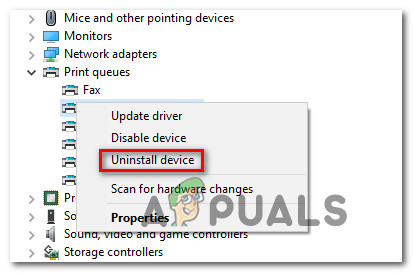 Uninstalling every printer port - Once you have successfully managed to uninstall every printer port, go ahead and expand the drop-down menu of Universal Serial Bus controllers. Once you do this, scroll down through the list of items and uninstall every Printer port by right-clicking on every entry and choosing Uninstall from the context menu.