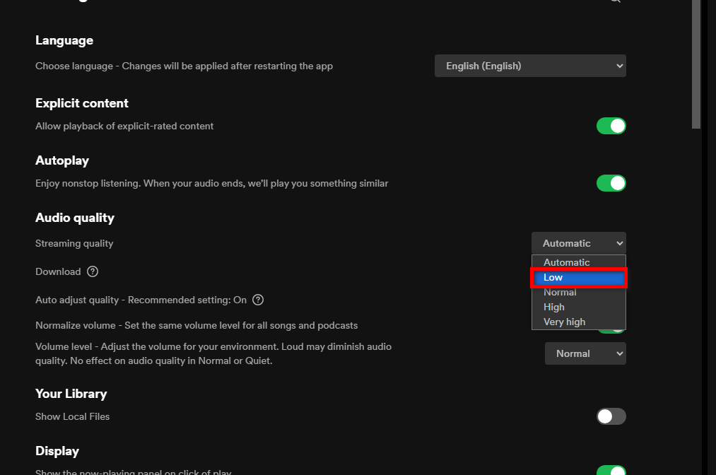 - Navigate to Streaming Quality and change the setting to Automatic or select a lower quality option.