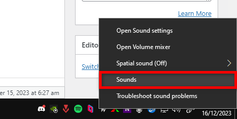 - On the taskbar, right-click the Volume Icon and choose ‘Sounds’.